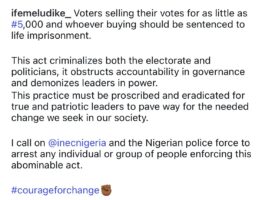 “Voters selling their votes for as little as ₦5,000 and whoever buying should be sentenced to life imprisonment. This act criminalises both the electorate and politicians, obstructs accountability in governance, and demonises leaders in power.