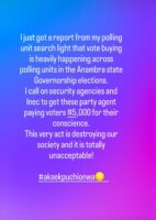 “I just got a report from my polling unit searchlight that vote buying is heavily happening across polling units in the Anambra State Governorship elections. I call on security agencies and INEC to get these party agents paying voters ₦5,000 for their conscience,”