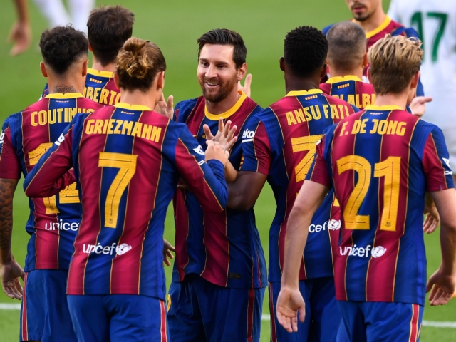 Barcelona's French forward Antoine Griezmann celebrates with Barcelona's Argentinian forward Lionel Messi after scoring the opening goal during the 55th Joan Gamper Trophy friendly football match between Barcelona and Elche at the Camp Nou stadium in Barcelona on September 19, 2020. (Photo by Josep ...