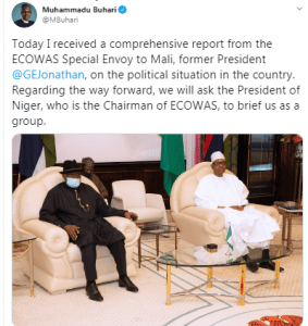 President Muhammadu Buhari, today, received a comprehensive report from the ECOWAS Special Envoy to Mali, former President Goodluck Jonathan, on the political situation in the country.