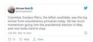 Columbia’s Senator and former guerilla Gustavo Petro has been decisively elected as the left’s presidential candidate, placing him in a strong position to become the country’s first-ever leftist president in May.