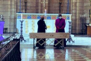 R- Anglican Archbishop Thabo Makgoba, (L) Dean of St. George’s Cathedral Michael Weeder stand next to coffin with remains of South African anti-Apartheid icon Archbishop Desmond Tutu...