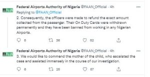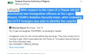 FAAN in a series of tweets from its official twitter handle @FAAN_official said it was able to identify the culprits following the outcry from the mother of the 14 Year old girl who was travelling to Canada from Nigeria.