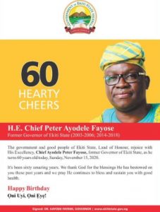 He said “The government and good people of Ekiti State, Land of Honour, rejoice with His Excellency, Chief Ayodele Peter Fayose, former governor of Ekiti State, as he turns 60 years old today, Sunday, November 15, 2020.