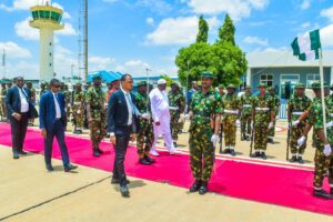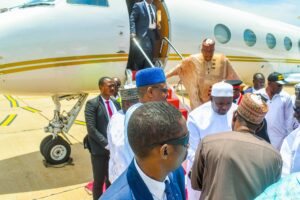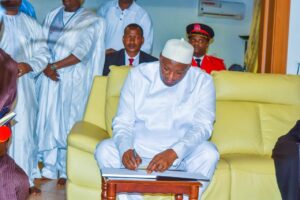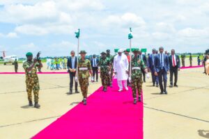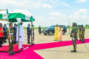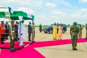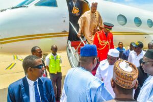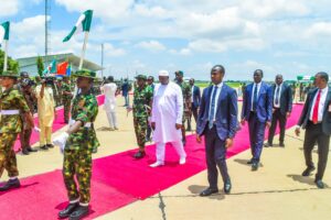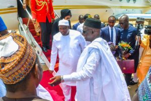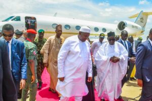 President Barrow, accompanied by his wife, Fatoumata Bah-Barrow, arrived at Umaru Musa Yar’adua International Airport, Katsina, at 12:35 PM, on Friday and was received by the Secretary to the State Government, Barrister Abdullahi Garba Faskari.