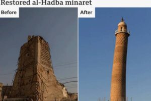 He saw the gloriously skewed al-Hadba minaret, known as the “hunchback”, which had been emblematic of Mosul for hundreds of years, in ruins.
