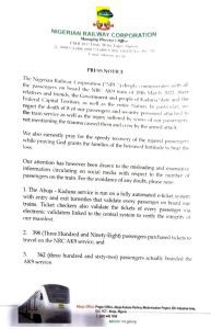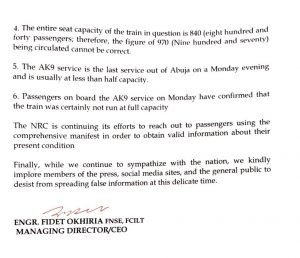 Meanwhile, In a statement issued on Thursday by the MD/CEO, Engr. Fidet Okhiria fnse, FCILT stated that the attention of the NRC has been drawn to the misleading and insensitive information circulating on social media with respect to the number of passengers on the train.