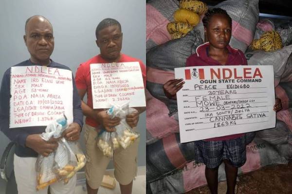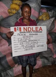 In Ogun, a 30-year-old lady, Peace Egidigbo, was arrested with 1863kg of Cannabis Sativa in Mowe, Obafemi/Owode LGA on Wednesday 23rd March, while no less than 150 blocks of cannabis weighing 90.800kg were seized from the cargo compartment of a bus owned by a transport company along Orji river via Onitsha express road, Enugu state.
