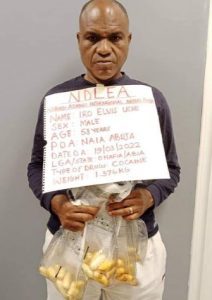 Elvis, who is 53 years old and the father of four children, hails from Abiriba in Abia state’s Ohafia local government area. He was apprehended on Saturday, March 19th, while boarding an Ethiopian Airlines flight from Addis-Ababa for eating 65 cocaine pellets weighing 1.376kg.