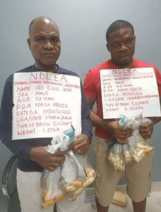 The National Drug Law Enforcement Agency, NDLEA have arrested two drug traffickers, Elvis Uche Iro, 53 and Uwaezuoke Ikenna Christian, 42, at the Nnamdi Azikiwe International Airport, NAIA, Abuja, for ingesting the illicit drug. They excreted the drugs while under observation in the Agency’s custody.