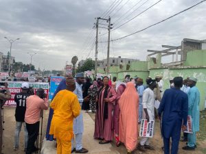 They carried banners and placards with varied slogans in front of the demolished multi-million Naira Daula Hotel on Hadejia Road in the state.