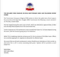 The Transmission Company of Nigeria (TCN) declared a force majeure on the Ikeja West–Osogbo 330kV transmission line following a severe rainstorm that damaged the tower.
