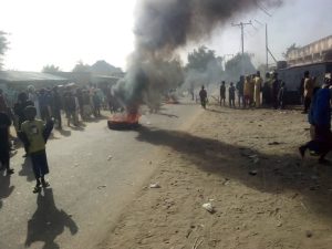 A resident of the a resident who spoke with Tvc News on the condition of anonymity says yesterday evening some men seen on military uniform came to a filling station on motorcycles with their heads covered and asked everyone to be calm, a scared driver attempted to escape and was shot dead, this triggered the protest”.