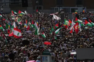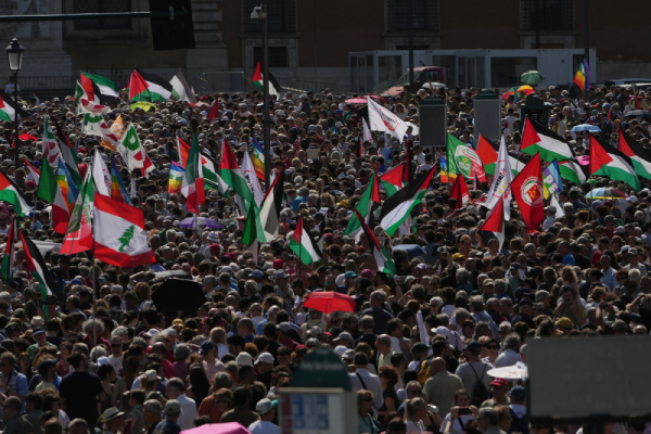 It made its way from Rome’s central Piazza Vittorio to San Giovanni, where speakers took to a stage to urge an end to the violence and denounce what some called the silence of the far-right Italian government of Prime Minister Giorgia Meloni.