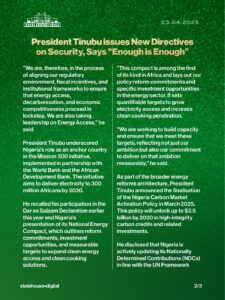 Tinubu announced that Nigeria finalised its Carbon Market Activation Policy in March 2025, which could unlock $2.5 billion in carbon credit investments by 2030.