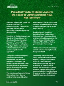 Speaking at a high-level virtual climate dialogue co-hosted by UN Secretary-General António Guterres and Brazilian President Luiz Inácio Lula da Silva, Tinubu outlined Nigeria’s ambitious clean energy transition plans.