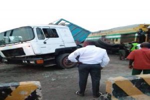 A minor road accident has occurred between a train and a truck loaded with animal feed at Jonathan Coker Railway Level Crossing, Abule Egba area of Ifako-Ijaiye Local Government Area, Lagos.